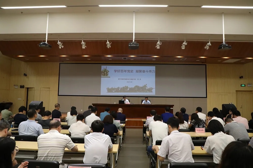 為幫助公司黨員干部更好地理解和開展黨史學習教育,6月24日,公司黨委邀請了南寧市委市直機關工委副書記藍迅為公司黨員干部上了一堂生動的黨史學習教育專題黨課,公司黨委書記韋文學主持會議,公司全體黨員和中層以上領導干部近160余人現(xiàn)場聆聽了專題黨課。