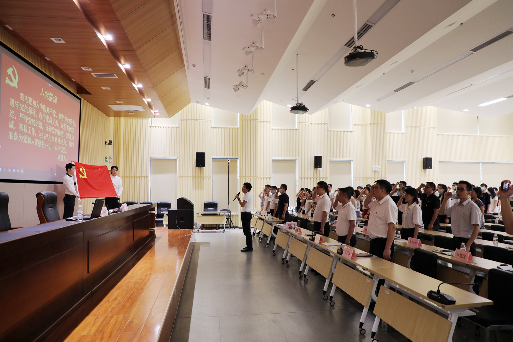 “我志愿加入中國(guó)共產(chǎn)黨,擁護(hù)黨的綱領(lǐng)……”錚錚誓言,拳拳初心。全體與會(huì)黨員面向鮮紅的黨旗,莊嚴(yán)地舉起右拳,用慷慨激昂的誓言重溫入黨時(shí)許下的莊嚴(yán)承諾,衷心表達(dá)對(duì)黨的絕對(duì)忠誠(chéng)和為黨的事業(yè)奮斗終身的決心和愿望。